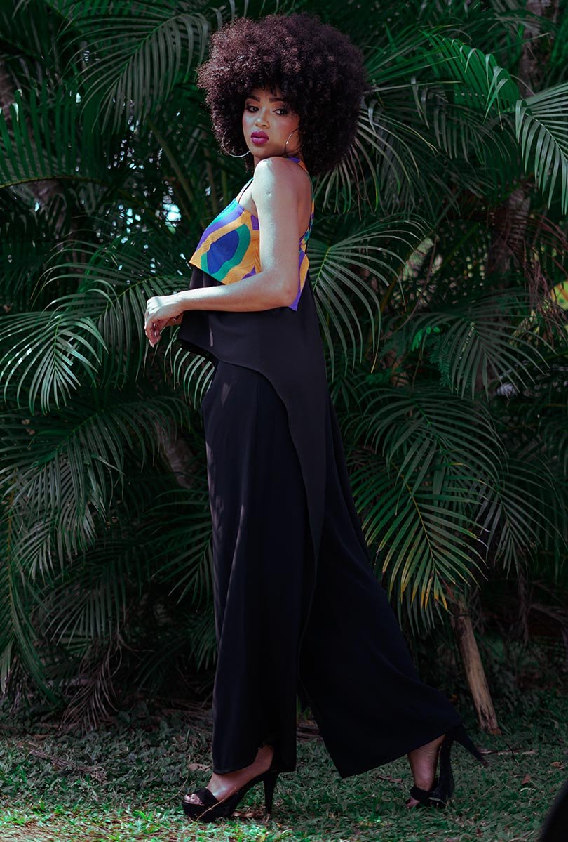 Conjunto Negro con Blusa Estampada Étnica Espalda descubierta Cruzada